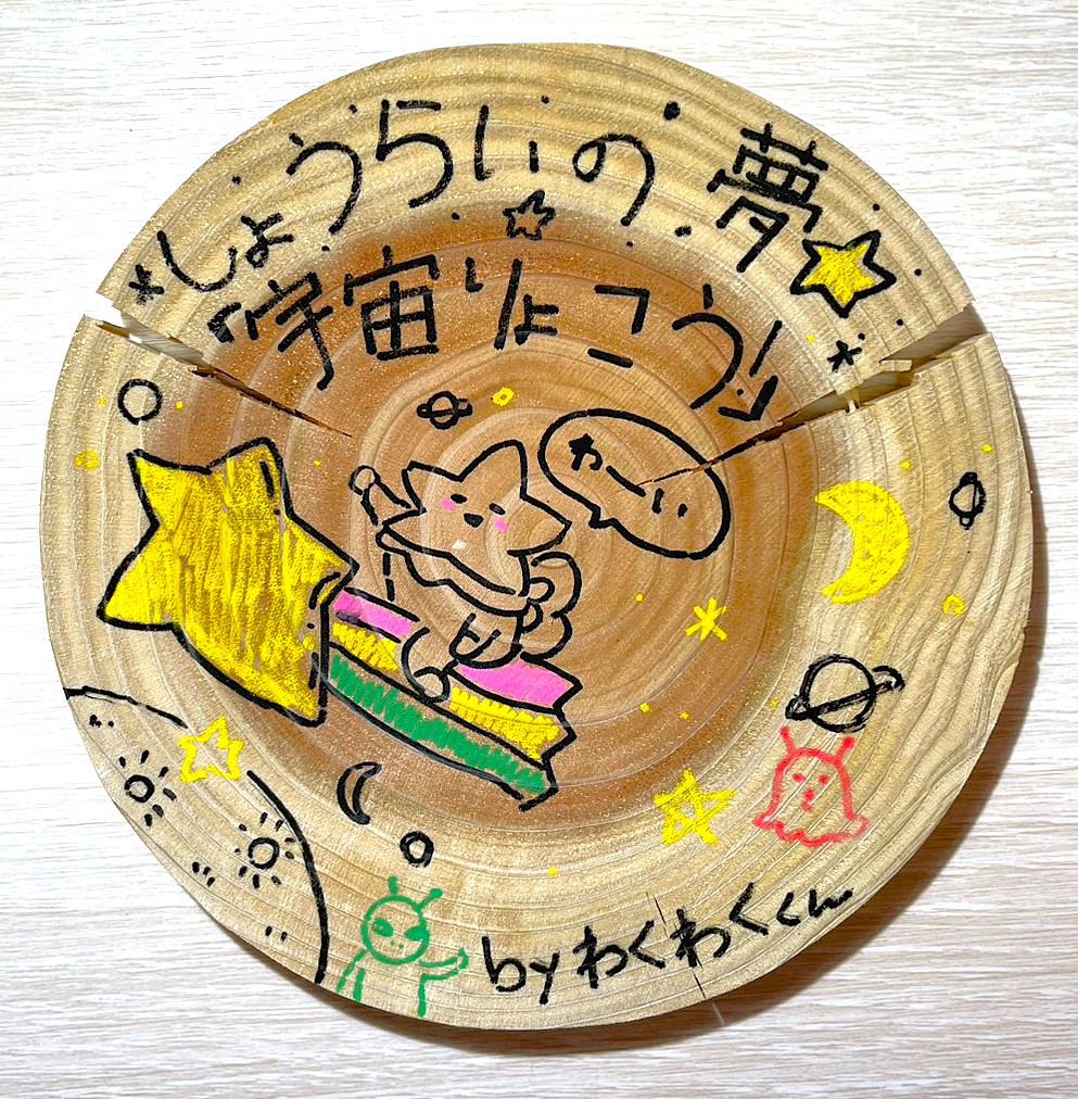 丸太の絵馬に、願い事や夢を描いて飾ってね♪